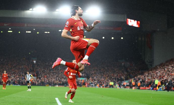 第87分鐘,利物浦用瓊斯和努涅斯分別替下麥卡利斯特和迪亞斯,紐卡斯爾用朗斯塔夫替下吉馬良斯。第88分鐘,索博斯洛伊直塞,薩拉赫點球點右側捅射被紐卡斯爾守門員波普撲出底線。隨后,加克波利用角球機會打進一球,由于利物浦球員沖撞紐卡斯爾守門員在先,因而進球被判無效。補時第3分鐘,加克波小禁區前倒勾射門偏出右門柱。補時第4分鐘,瓊斯傳球,索博斯洛伊禁區弧頂射門被防守球員阻擋。最終,利物浦主場2-0完勝紐卡斯爾,在連續24輪聯賽保持不敗后,以13分優勢領跑英超積分榜。